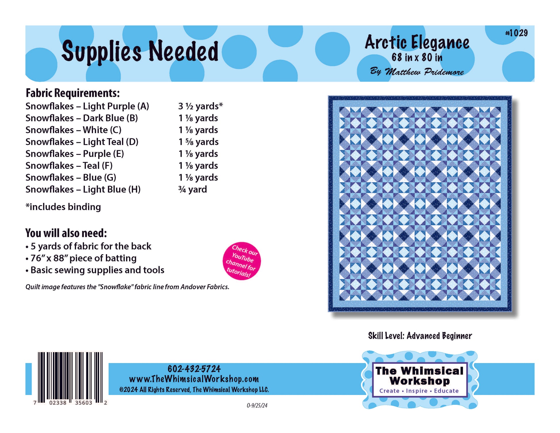 Create a stunning winter-inspired bed quilt with the Arctic Elegance pattern by Matthew Pridemore of The Whimsical Workshop. Featuring the Snowflake fabric line, this 68" x 80" quilt in beautiful winter blues is perfect for advanced/confident beginners. It is ideal for adding seasonal charm to your bedroom.