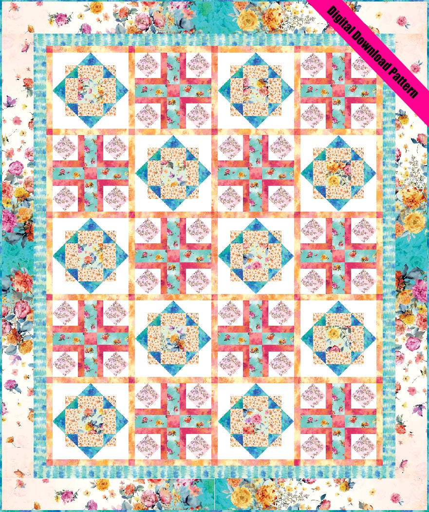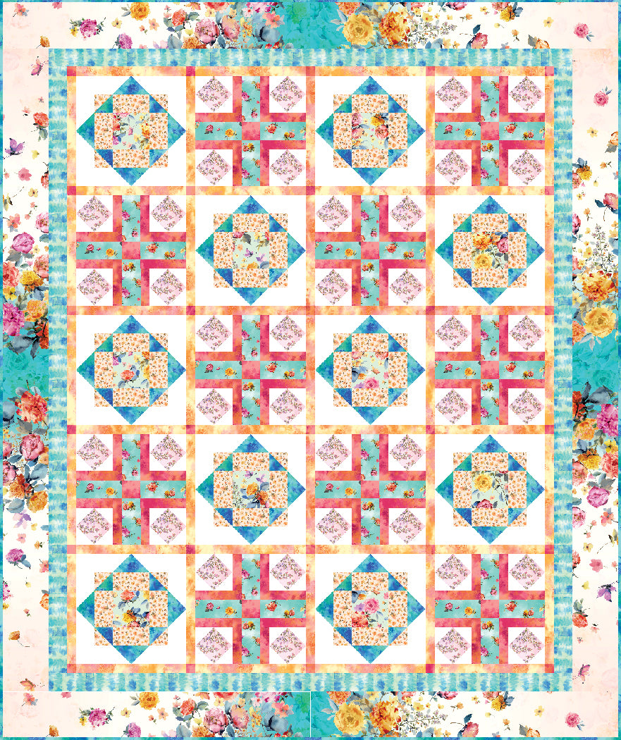 Quilt image features the "Primrose Garden" fabric line from Michael Miller Fabrics.