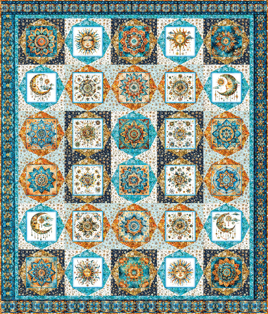 Brighten up your bedroom with the Boho Sunshine quilt pattern by Matthew Pridemore of The Whimsical Workshop. This 69" x 81" intermediate-level quilt features celestial suns and moon panels from the Bohemian Sunrise fabric line, perfect for adding a touch of cosmic charm to your space. Creative Grids 2-Peaks-in-1 Ruler is helpful with this pattern.