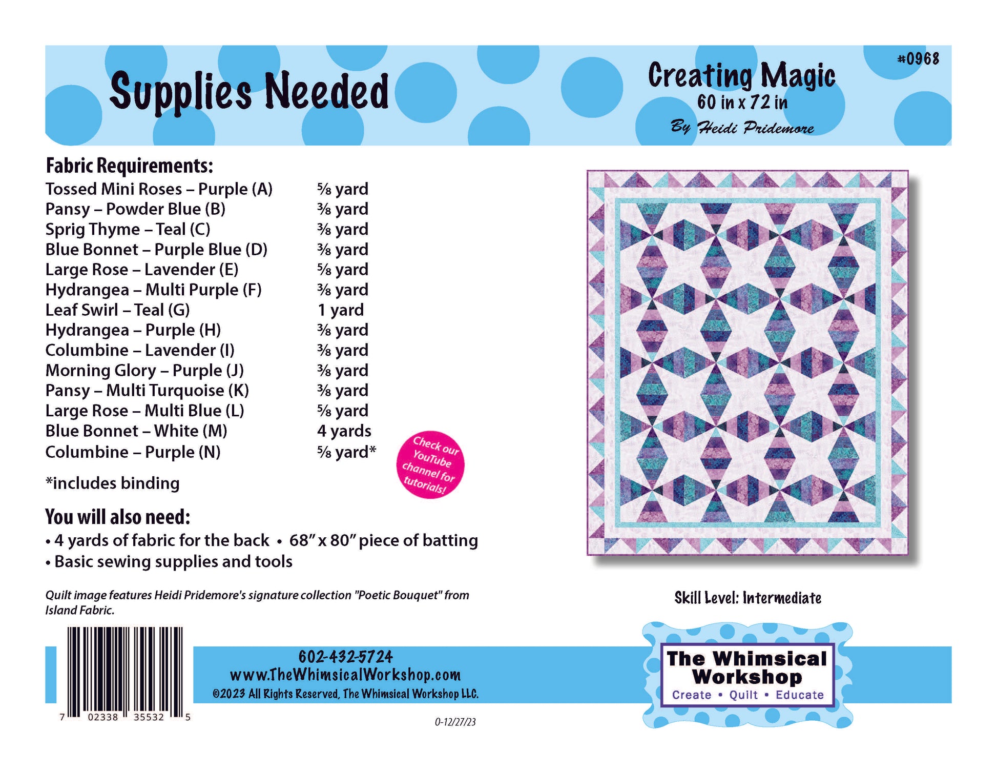 Bring vibrant artistry to your sewing with Creating Magic, a quilt pattern by Heidi Pridemore for The Whimsical Workshop. Featuring Poetic Bouquet, Heidi’s signature batik collection from Island Batik, this 60" x 72" quilt dazzles with rich color and dynamic design. Perfect for intermediate, the pattern uses traditional piecing techniques and is enhanced by the recommended Creative Grids 2-Peaks-1 Ruler (available under notions) for precision cutting. A magical project that beautifully showcases batik fabrics in a bold, creative layout.