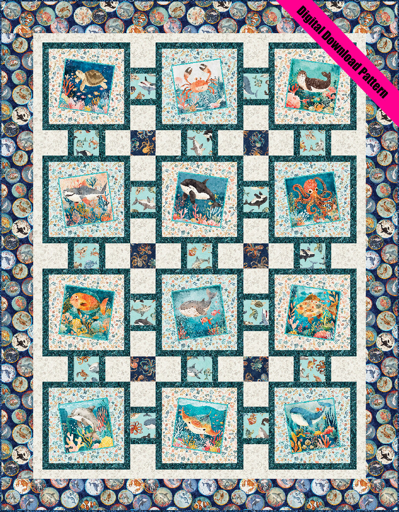 Dive into creativity with the Deep Blue Sea quilt pattern by Heidi Pridemore of The Whimsical Workshop, featuring the Deep Sea Dazzle fabric line. This 63" x 81" intermediate-level quilt showcases whimsical sea life blocks, perfect for bringing an ocean-inspired touch to your next project. Fabric kits also available.