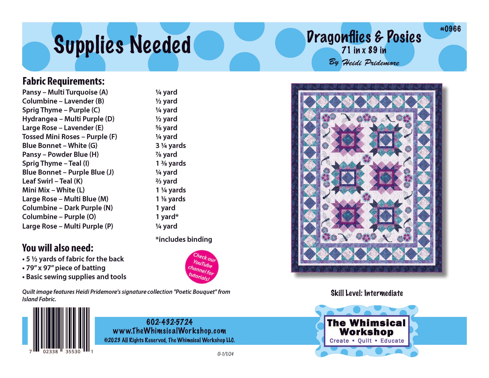 Bring elegance and nature to your quilting with Dragonflies & Posies, a beautiful pattern by Heidi Pridemore for The Whimsical Workshop. This 71" x 89" quilt features Poetic Bouquet, Heidi’s signature batik collection from Island Batik, and combines floral and dragonfly motifs in a vibrant layout. Designed for advanced beginners, the pattern uses traditional and easy strip piecing techniques to make assembly quick and enjoyable. A stunning project that celebrates color, movement, and the beauty of batiks.