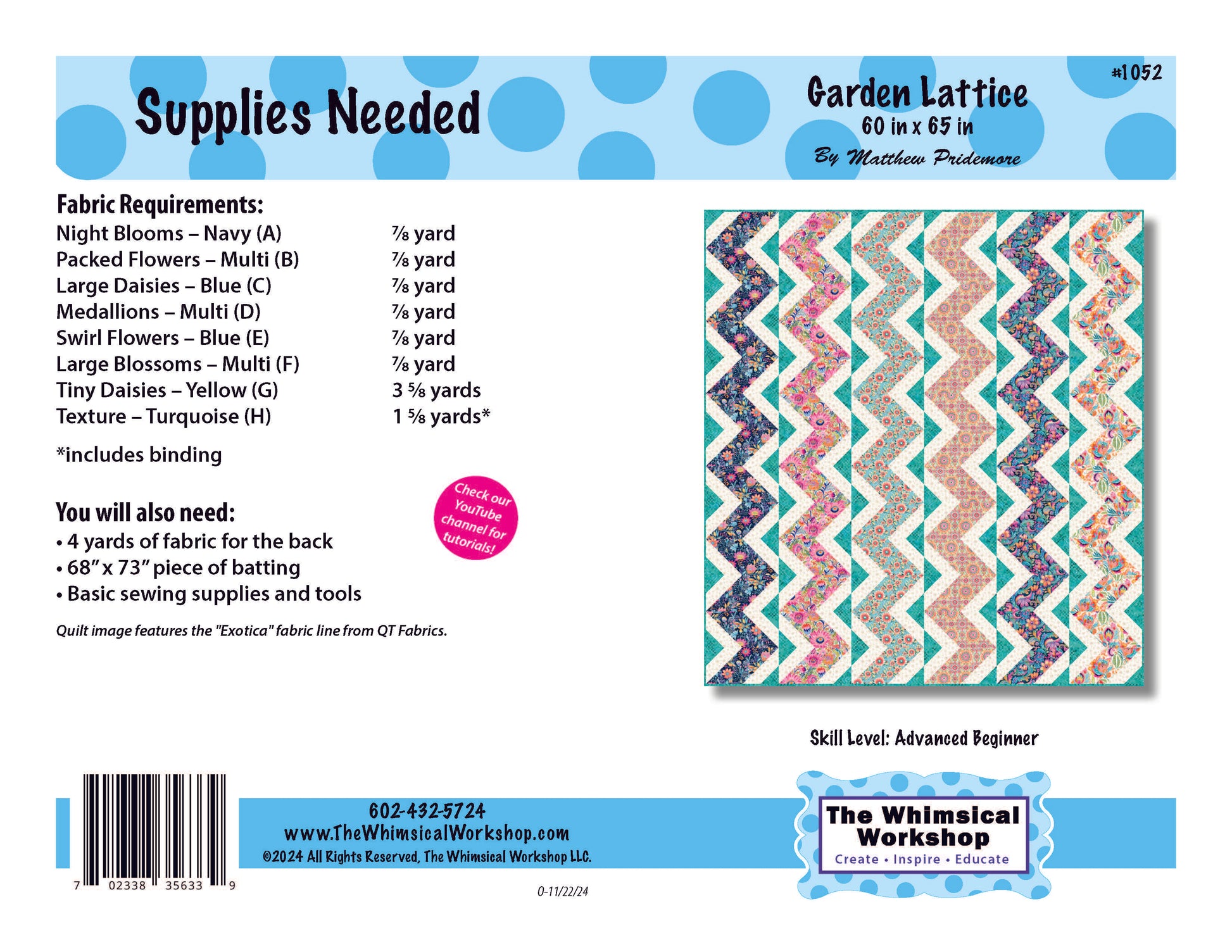 Bring elegance and vibrant color to your quilting projects with the Garden Lattice Quilt Pattern, beautifully designed by Matthew Pridemore for The Whimsical Workshop. This stunning quilt showcases the lush Exotica fabric collection from QT Fabrics, offering a rich palette of bold florals and striking prints that breathe life into every block.