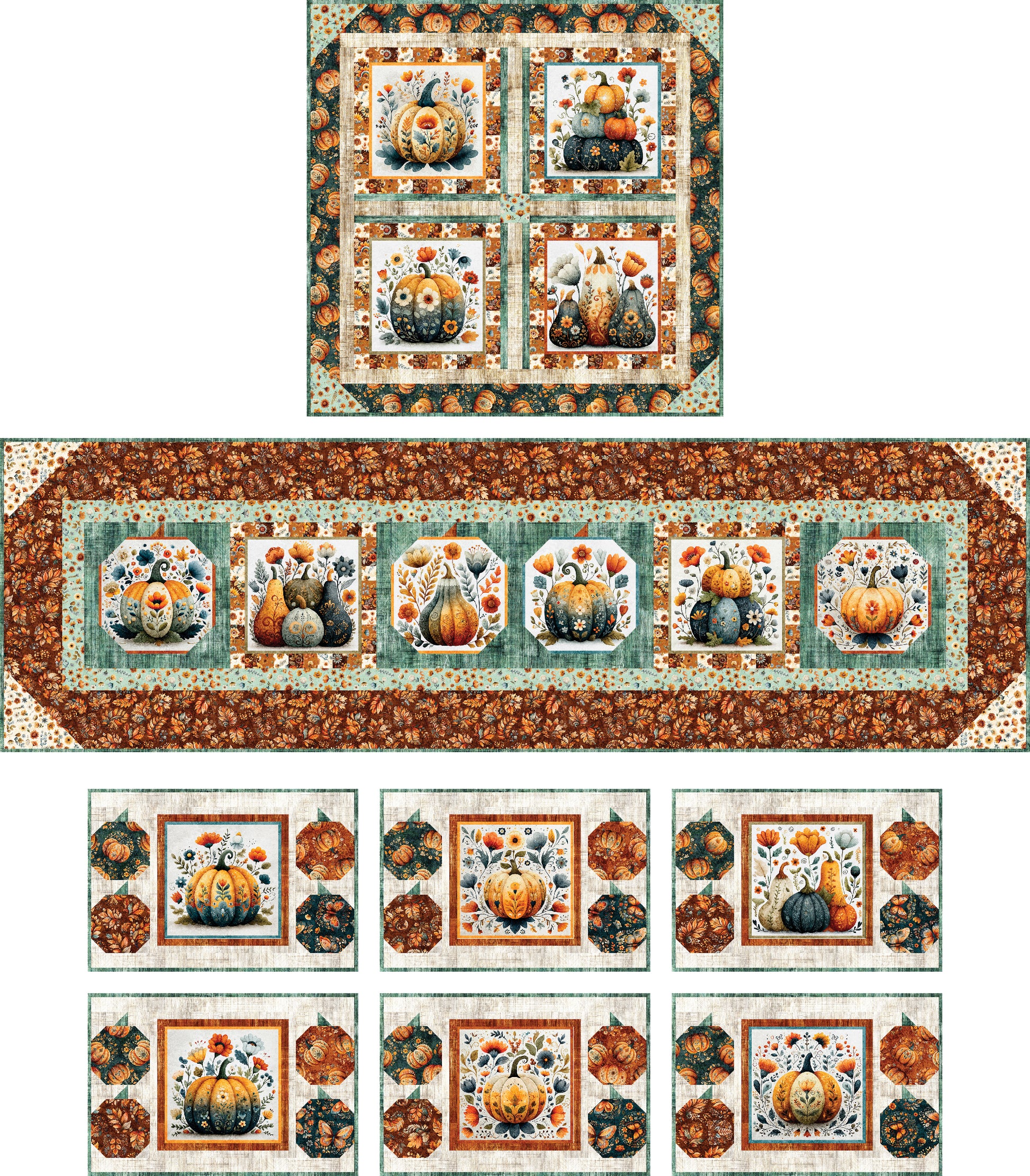 • Design Notes: Simple piecing highlights the fun pumpkin panel in a coordinated quilt and table set