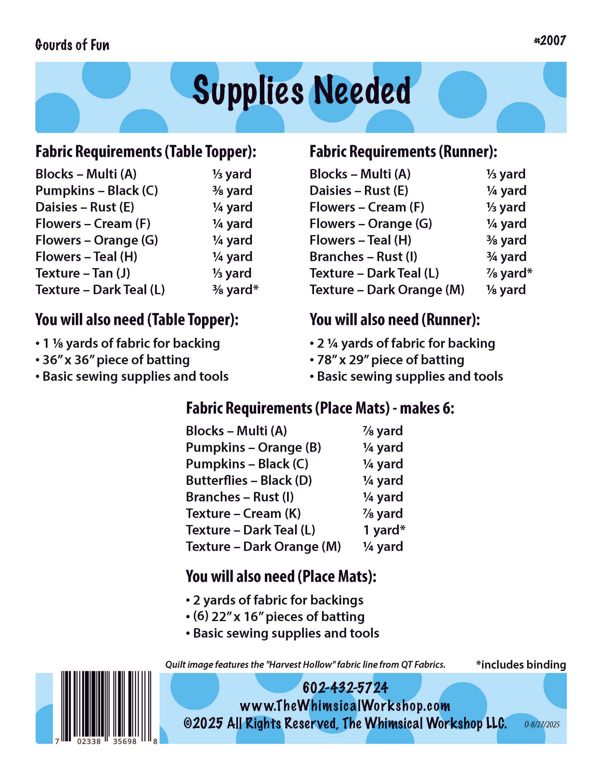 Celebrate the harvest season with Gourds of Fun, a festive quilt, runner, and placemat pattern by Matthew Pridemore for The Whimsical Workshop. Featuring simple piecing techniques, this advanced beginner-friendly design showcases the playful pumpkin panel from the Harvest Hollow fabric collection by QT Fabrics. The coordinating set includes a 28" x 28" quilt, a 70" x 21" runner, and 18" x 12" placemats—perfect for adding a cozy autumn touch to your home décor or seasonal table setting. With its warm fall colors and cheerful motif, Gourds of Fun is sure to become a seasonal favorite year after year.