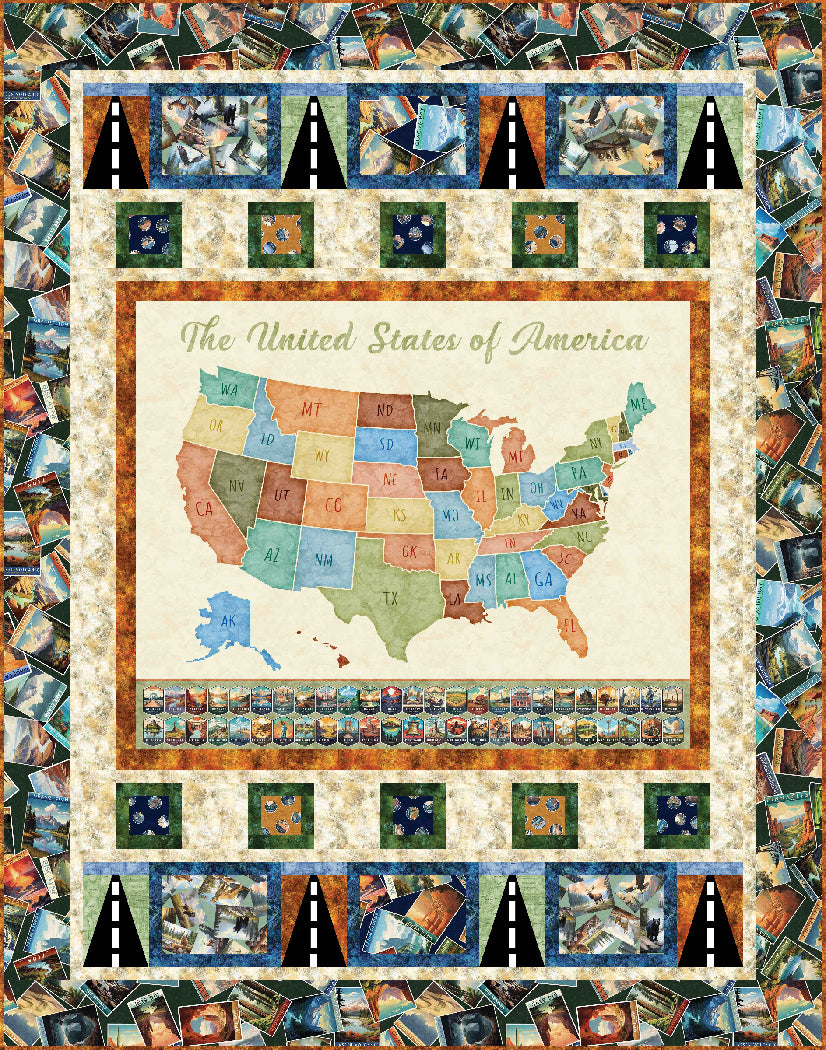 Quilt image features the "On the Road Again" fabric line from QT Fabrics.
