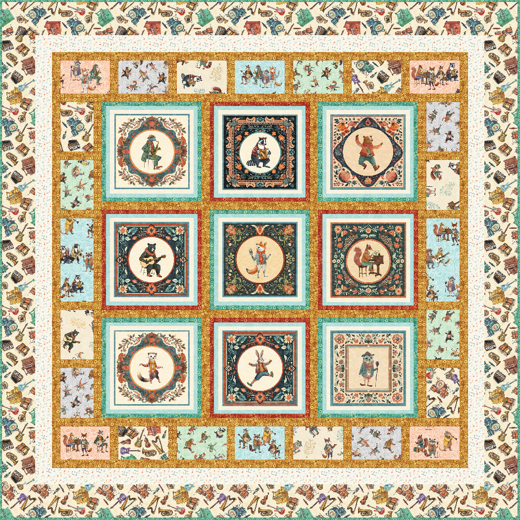 Quilt image features the "Jug Band Jamboree" fabric line from QT Fabrics.