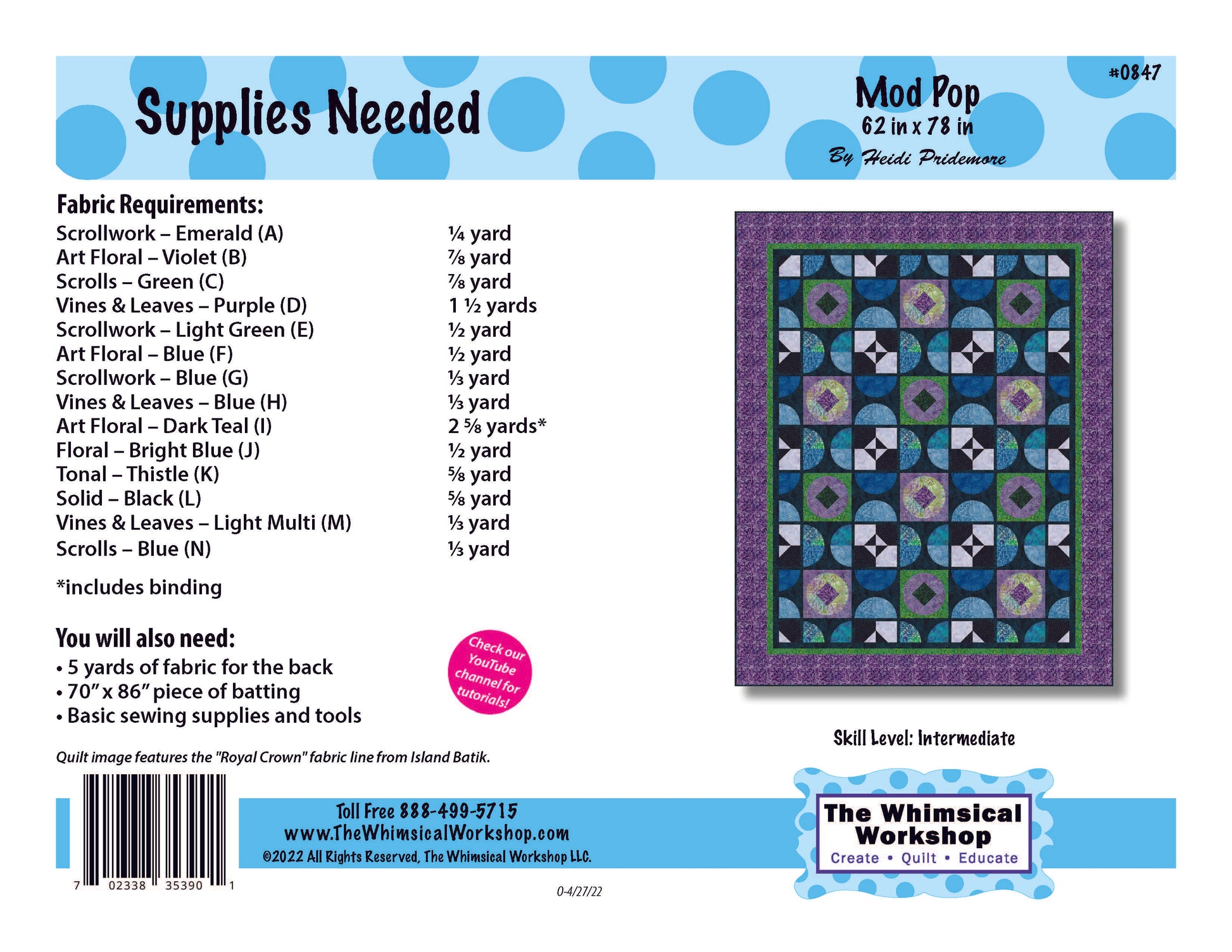 Add bold style to your quilting with the Mod Pop Quilt Pattern and Fabric Kit, designed by Heidi Pridemore for The Whimsical Workshop. Featuring Royal Crown, Heidi’s signature batik collection from Island Batik, this 62" x 78" quilt combines traditional piecing with simple curve piecing for a fun, modern look. Perfect for intermediate quilters.