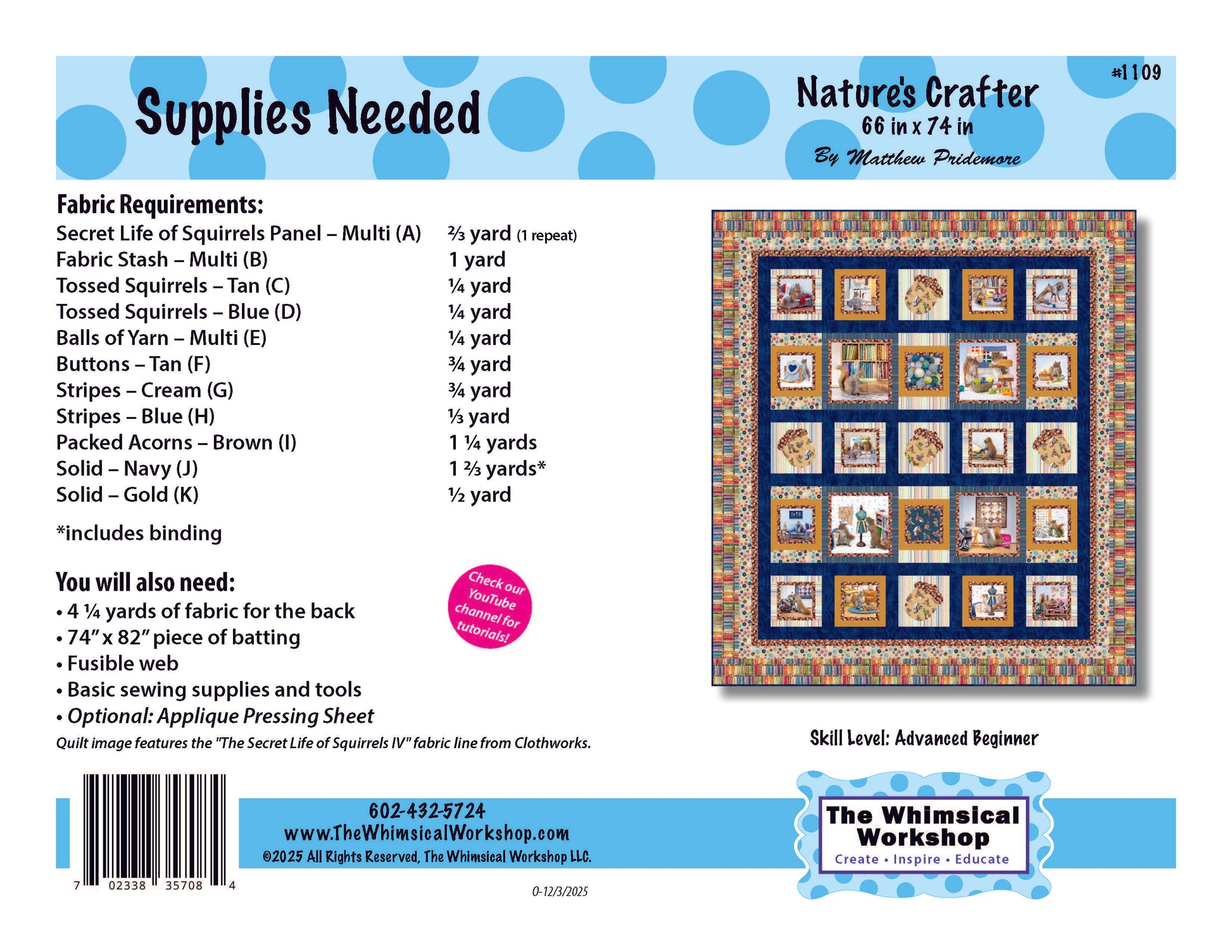Nature’s Crafter by Matthew Pridemore brings woodland charm to your quilting lineup. Measuring 66" x 74" (Large Throw), this advanced beginner pattern features “The Secret Life of Squirrels IV” collection from Clothworks. Ideal for quilters who enjoy nature themes and improving their piecing techniques.