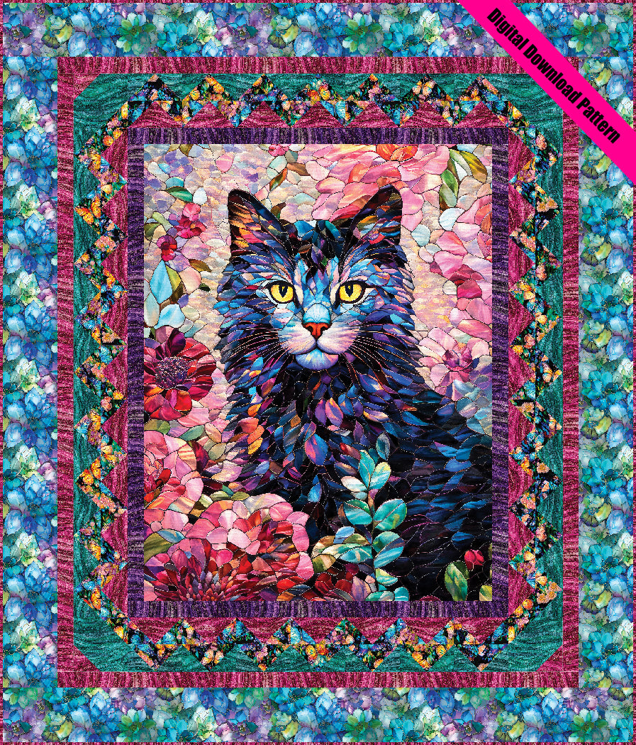Add some feline charm to your home with the Pretty Kitty quilt pattern by Matthew Pridemore of The Whimsical Workshop. This 58" x 68" advanced beginner-level lap quilt features a delightful 36" cat panel from the Gigi in the Garden fabric line, perfect for cat lovers looking to create a cozy and whimsical quilt