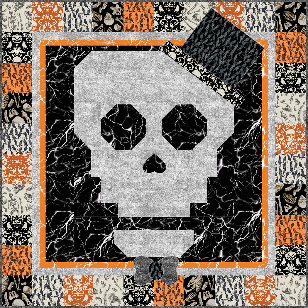 Craft the Skull Chic quilt pattern by Heidi Pridemore, a 40"x40" Halloween-themed design from The Whimsical Workshop. Perfect for advanced beginners, this pieced skull quilt features playful applique accents and showcases the Boo-tiful fabric line from Michael Miller Fabrics, adding a touch of whimsy to your Halloween decor.