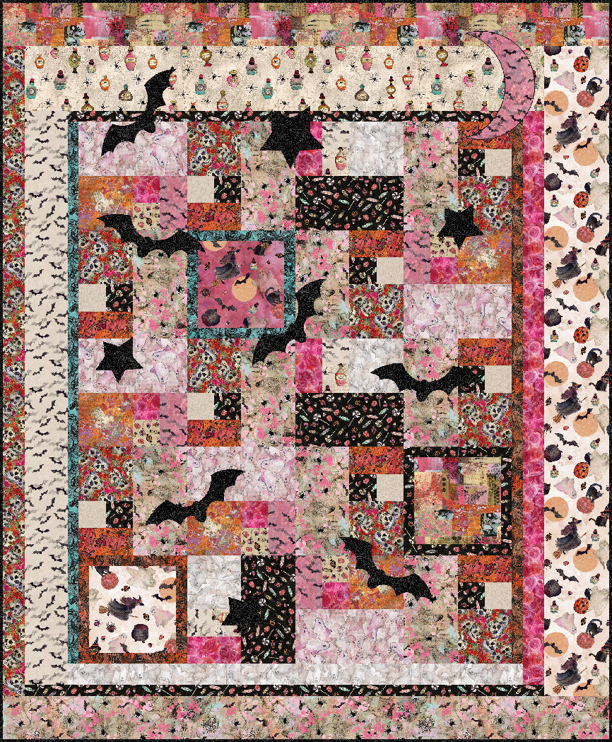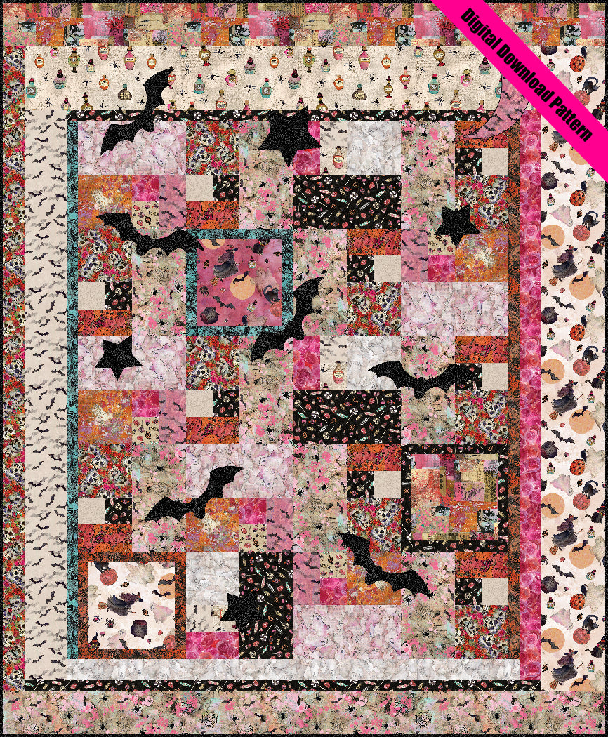Get into the Halloween spirit with the Spooky Grunge quilt pattern by Matthew Pridemore of The Whimsical Workshop. This 56" x 68" advanced beginner-level lap quilt features scrappy piecing and adorable appliquéd bats and stars, using playful pink, cream, and black fabrics from the Faboolous fabric line. Perfect for adding festive charm to your home.