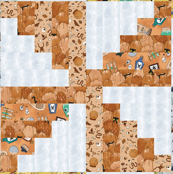 Introducing the "Steps to the Spell" quilt pattern designed by The Whimsical Workshop, featuring the charming Halloween fabric collection "Spellbound" from Benartex Fabric. This delightful pattern showcases offset Log Cabin blocks, making it an accessible project for quilters of all levels. Measuring 60" x 80", this quilt utilizes standard piecing techniques, ensuring a smooth and enjoyable quilting experience. While perfect for Halloween with the "Spellbound" fabric, this versatile pattern also adapts beautifully to any fabric theme you choose, allowing for endless creative possibilities. Create a captivating quilt that enchants and delights with "Steps to the Spell."