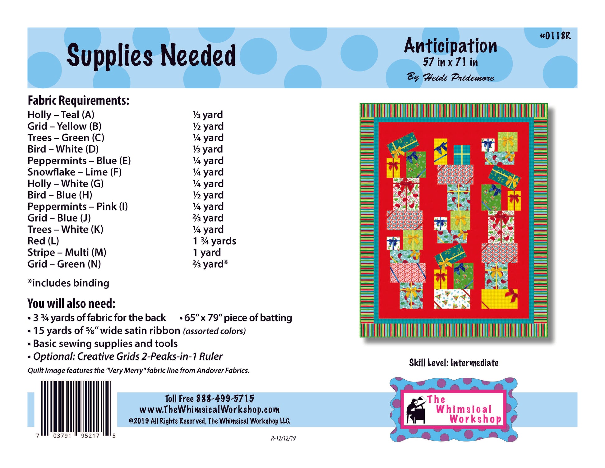 Celebrate the joy of giving with Anticipation, a festive quilt pattern by Heidi Pridemore for The Whimsical Workshop. Measuring 57" x 71", this intermediate-level design features pieced stacked presents, making it perfect for any holiday celebration. Created with traditional piecing techniques and showcasing the cheerful Very Merry collection from Andover Fabrics, this quilt is ideal for adding a playful, seasonal touch to your home décor. A great project for gift-giving or decking the halls with handmade cheer.