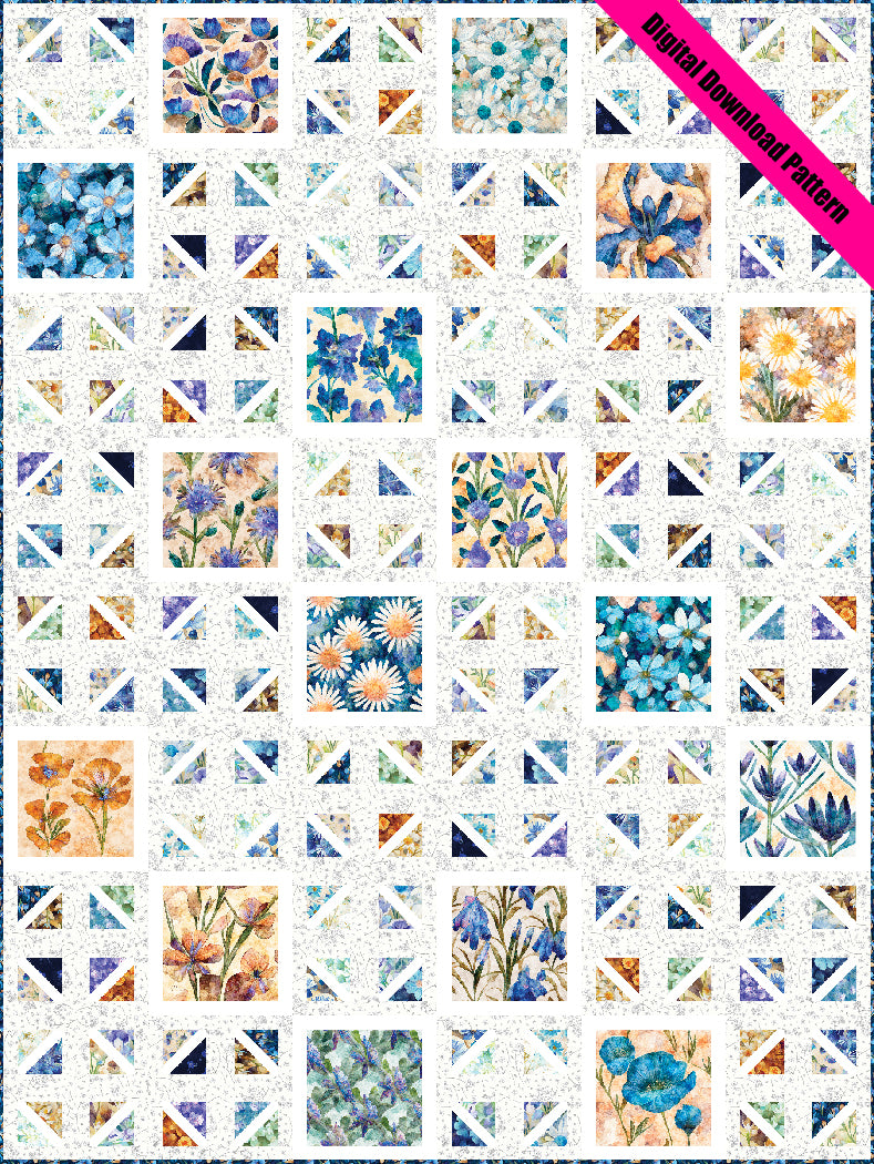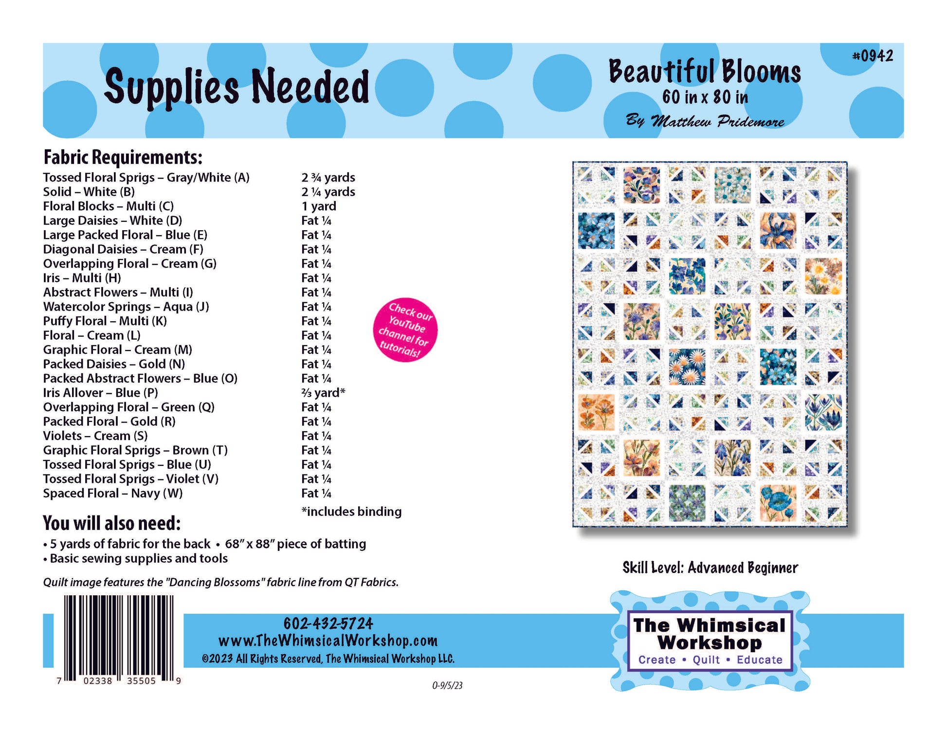 Celebrate the beauty of nature with Beautiful Blooms, a vibrant quilt pattern by Matthew Pridemore for The Whimsical Workshop. Measuring 60" x 80", this advanced beginner design uses traditional piecing to elegantly showcase the stunning floral prints from the Dancing Blossoms fabric collection by QT Fabrics. With its graceful layout and garden-inspired charm, Beautiful Blooms is perfect for spring décor, floral lovers, or anyone looking to highlight bold, blooming prints in a timeless quilt design.