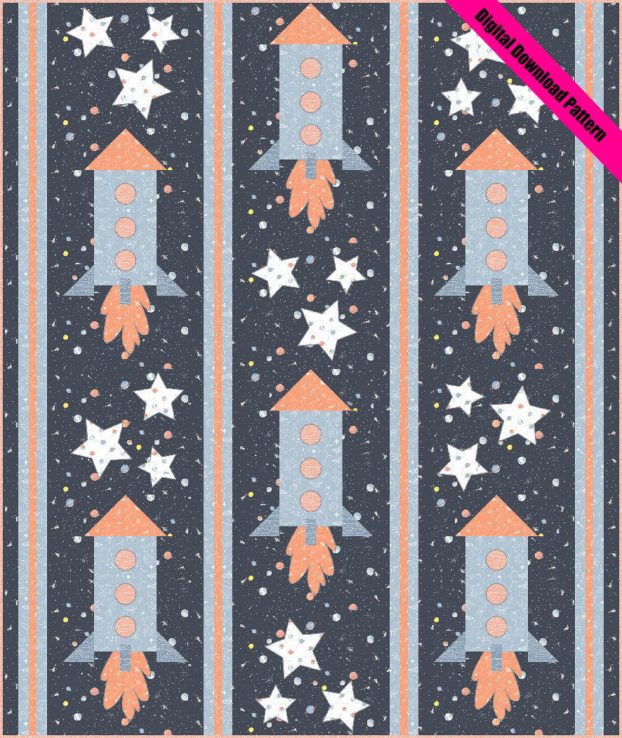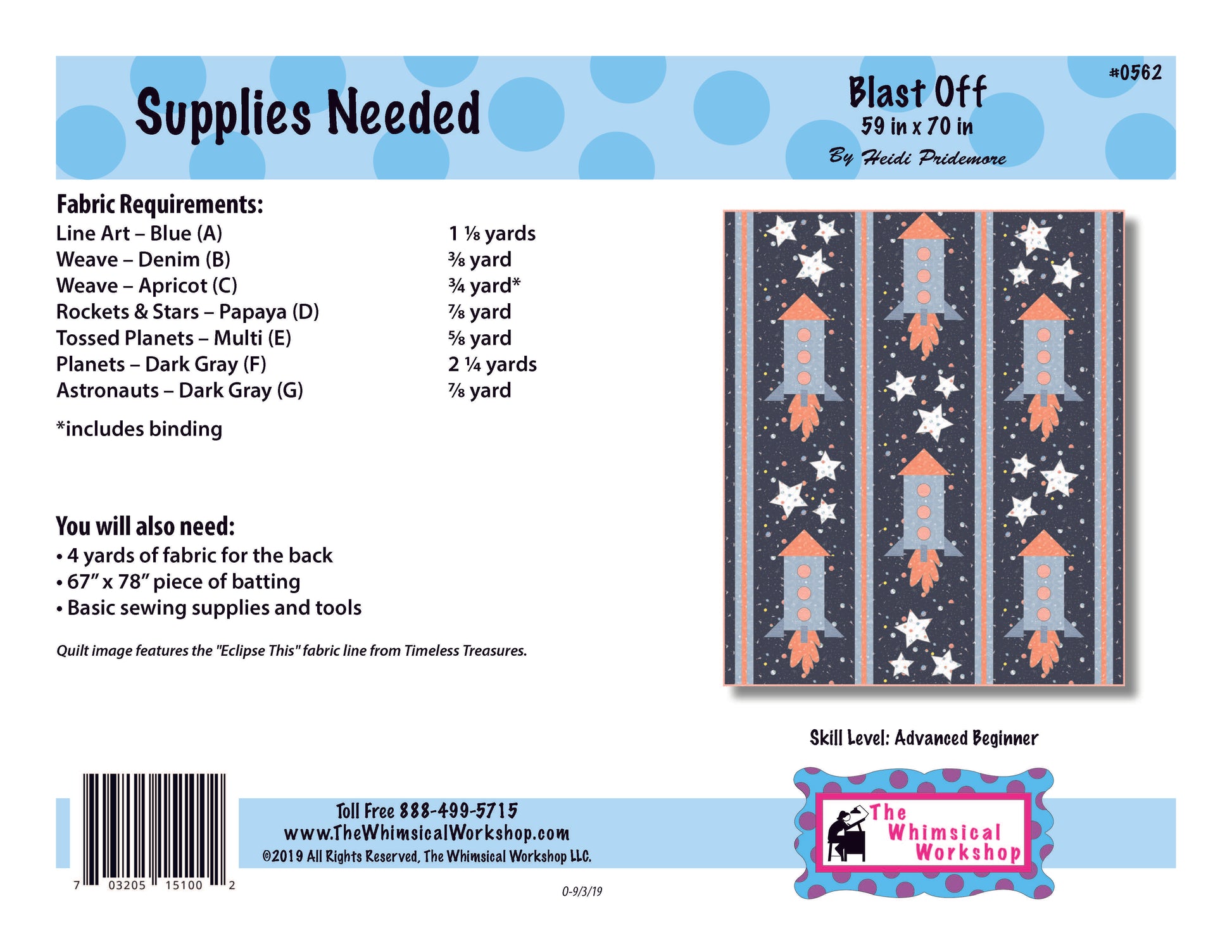 Launch your creativity with Blast Off, a fun and imaginative quilt pattern by Heidi Pridemore for The Whimsical Workshop. Measuring 59" x 70", this advanced beginner design combines traditional piecing with simple fusible appliqué to create adorable rockets soaring through space. Featuring the vibrant Eclipse This fabric collection from Timeless Treasures, this quilt is perfect for space-themed rooms, kids’ projects, or any budding astronaut. A playful and colorful project that’s as exciting to make as it is to display!