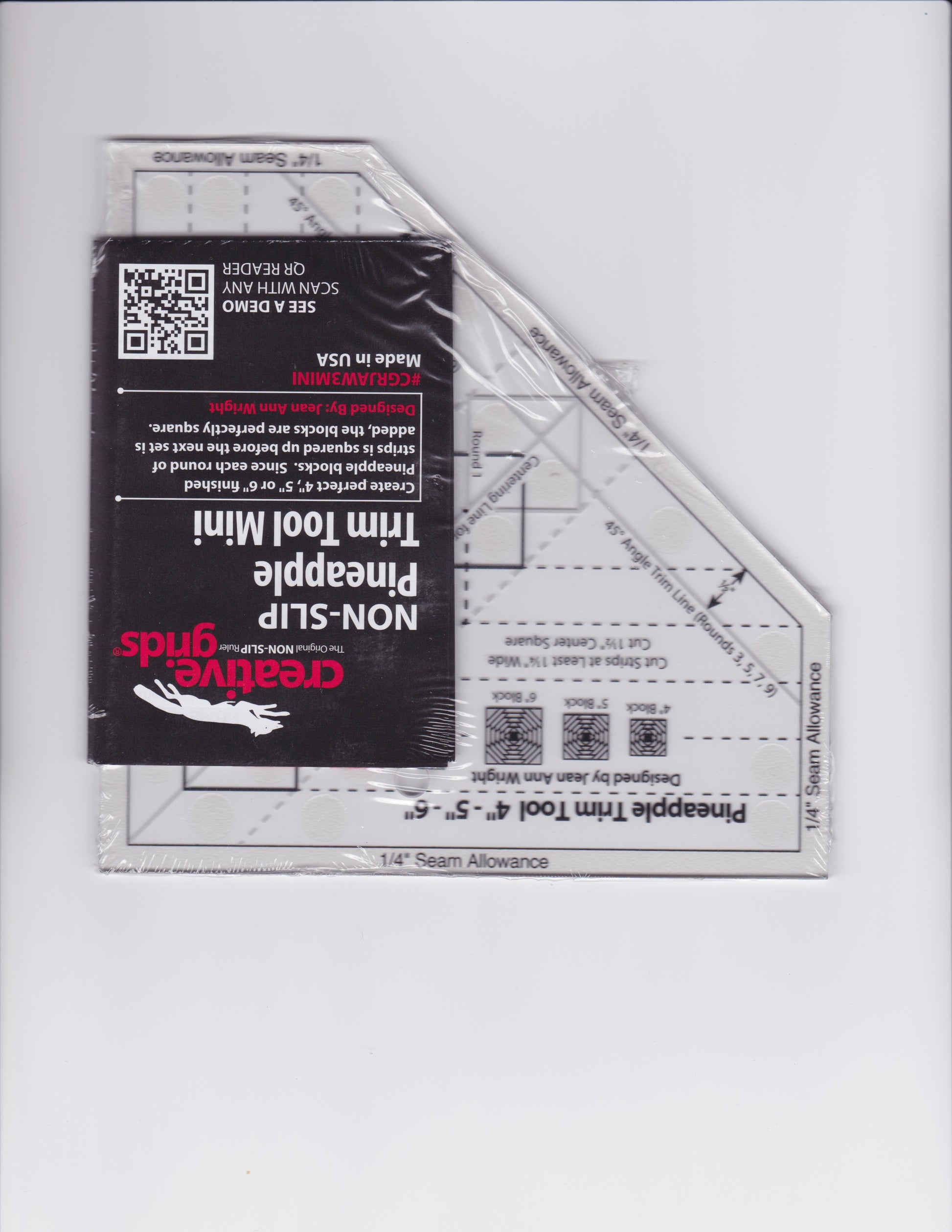 Create perfect 4, 5 or 6 inch finished Pineapple blocks by squaring up each round of strips as they are sewn. Since each round of strips is squared up before the next set is added, the blocks are perfectly square. The cutting requirements for the strips and center square are printed right on the tool. It comes with fully illustrated step by step instructions or scan the QR Code printed on the tool to view a video demonstration. Want to make larger pineapple blocks? The Pineapple Trim Tool (Item CGRJAW3) creates 6,8 and 10 inch finished blocks.
