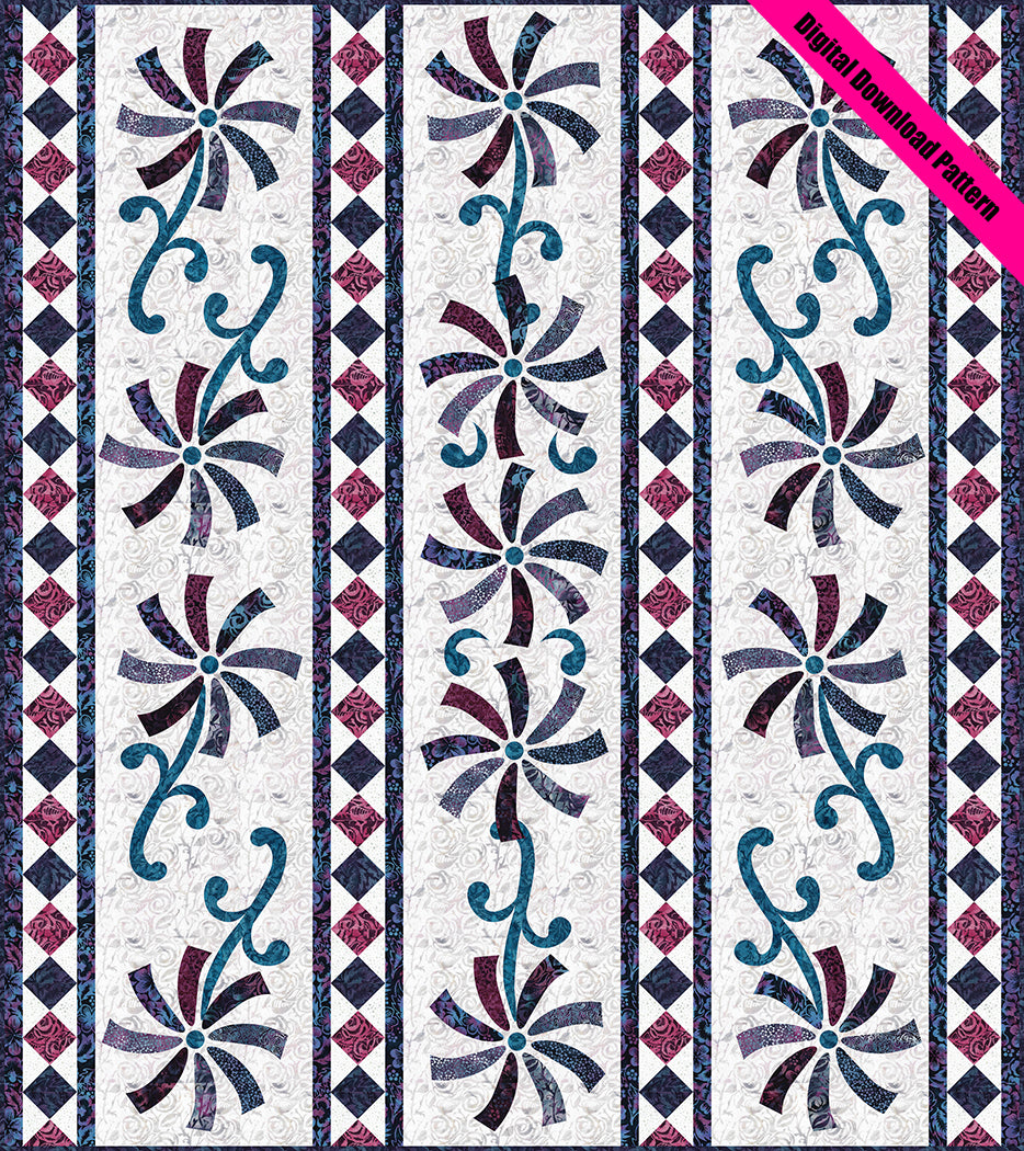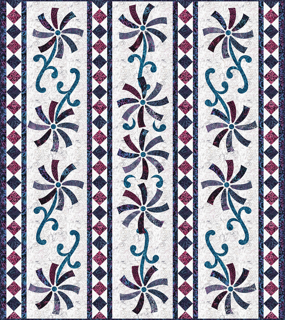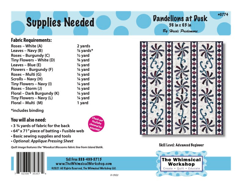 Dandelions at Dusk is a quilt pattern by Heidi Pridemore for The Whimsical Workshop. This 56" x 63" quilt is great for advanced beginner quilters, showcasing fusible applique, abstract, pink, blue and white. It features fabrics from the "Woodcut Blossoms" fabric line from Island Batik.
