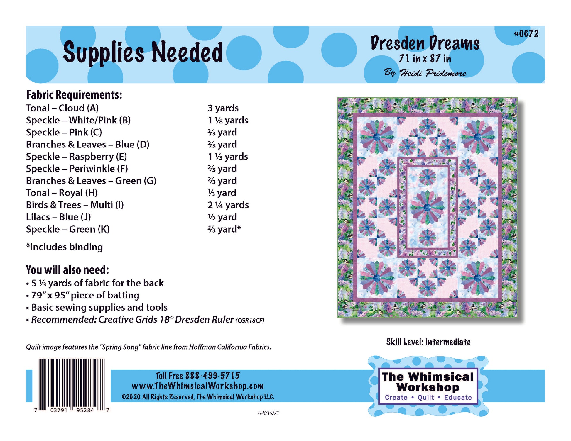 Bring timeless elegance to your quilting with Dresden Dreams, a stunning pieced and appliquéd quilt pattern by Heidi Pridemore for The Whimsical Workshop. Measuring 71" x 87", this advanced beginner-friendly design features traditional piecing and fusible appliqué to highlight the beautiful floral prints from the Spring Song collection by Hoffman Fabrics. Perfect for spring-inspired projects, Dresden Dreams combines classic Dresden plate elements with graceful fabric placement for a quilt full of charm and blooming beauty.