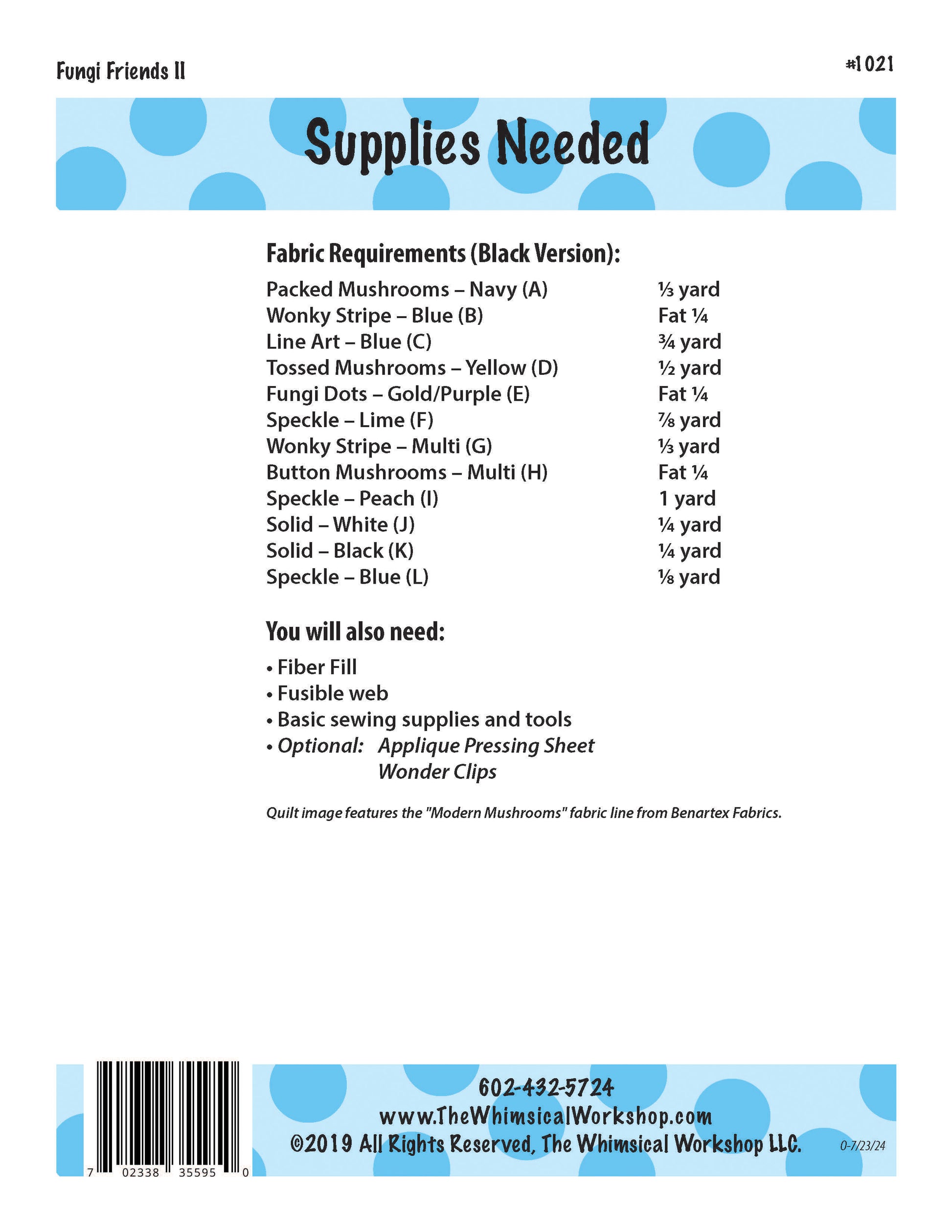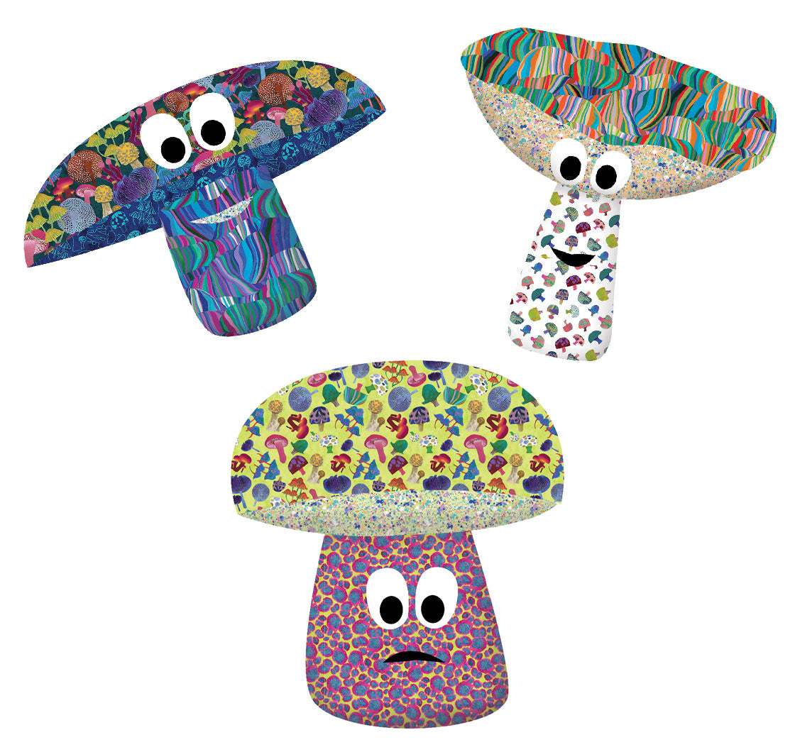 Discover the Fungi Friends II Pillow Pattern by The Whimsical Workshop, featuring three whimsical mushroom shapes: Portabello, Button, and Cremini. Perfect for intermediate sewers, these charming pillows use the Modern Mushrooms Fabric Collection from Benartex Fabrics. Create delightful home décor with sizes ranging from 20" x 20" to 22" x 14".