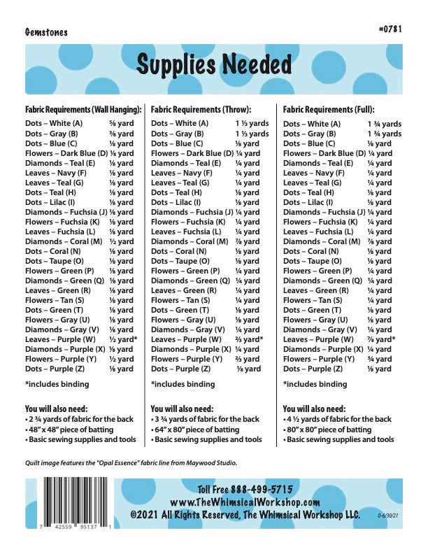 Gemstones is a quilt pattern by Mathew Pridemore for The Whimsical Workshop. This 40" x 40" (Wall Hanging), 56" x 72" (Throw), 72" x 72" (Full) quilt is great for beginner quilters, showcasing pieced, abstract, pastel colors. It features fabrics from the "Opal Essence" fabric line from Maywood Studio.