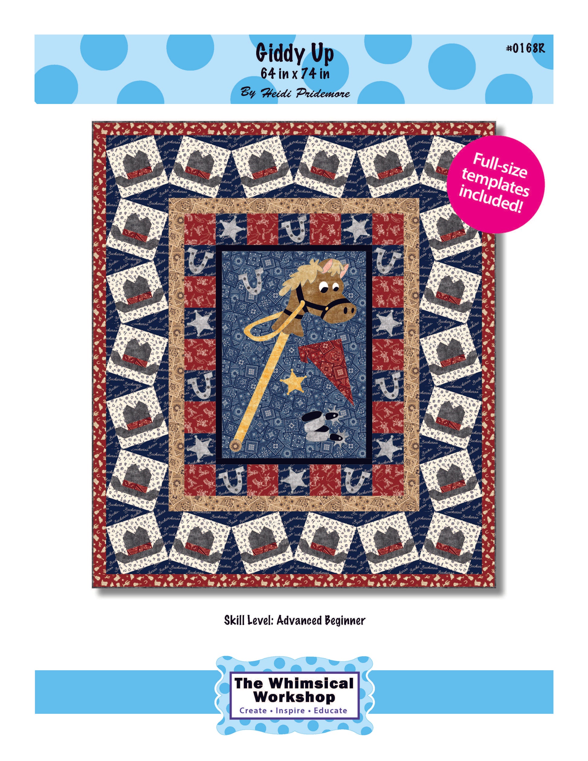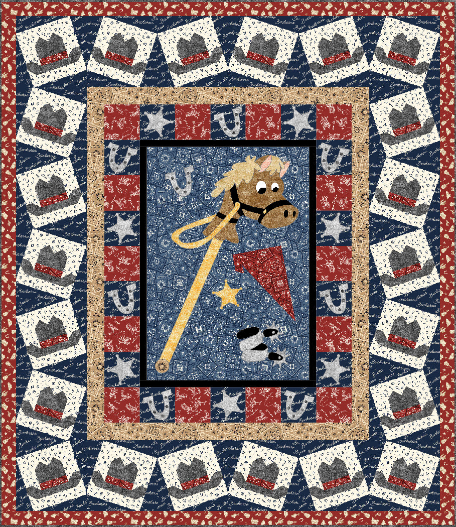 Saddle up for fun with Giddy Up, a charming fusible appliqué quilt pattern designed by Heidi Pridemore for The Whimsical Workshop. This 65" x 73" design features an adorable hobby horse appliqué at the center, surrounded by pieced cowboy hat blocks for a playful western theme. Showcasing the Buckaroo fabric collection from Michael Miller Fabrics, this pattern is perfect for confident beginners and up. A great choice for children's rooms, themed décor, or anyone who loves a little cowboy charm in their quilting projects.