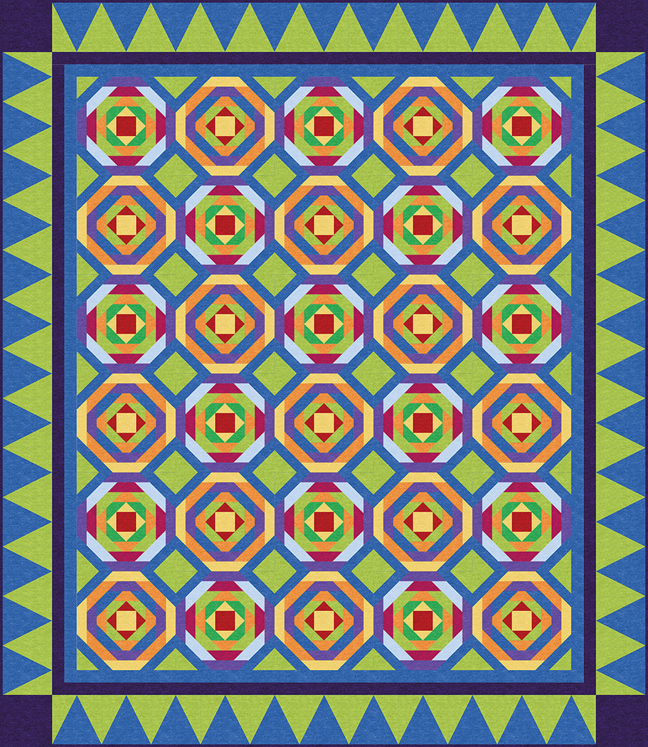 Quilt image features the "Cotton Shot" fabric line from Benartex Fabrics.