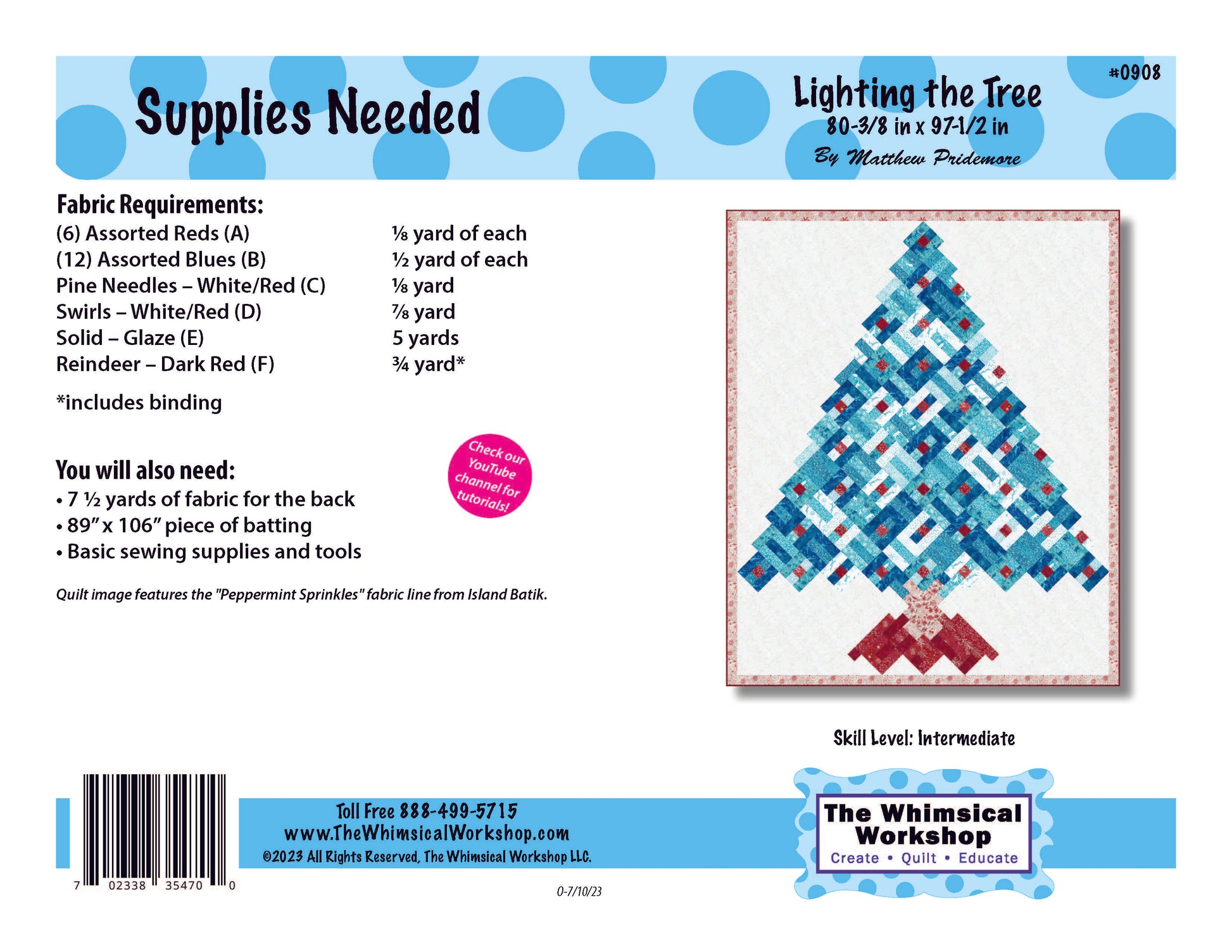Celebrate the season in style with Lighting the Tree, a festive quilt pattern or fabric kit by Matthew Pridemore for The Whimsical Workshop. Featuring a stunning Christmas tree made entirely from strip-pieced blocks, this 81" x 98" design uses Peppermint Sprinkles, Heidi Pridemore’s signature batik collection from Island Batik. Perfect for advanced beginners, it combines traditional piecing with vibrant holiday batiks. Choose the pattern alone or the complete fabric kit with all materials for the quilt top and binding—ideal for a holiday showstopper.