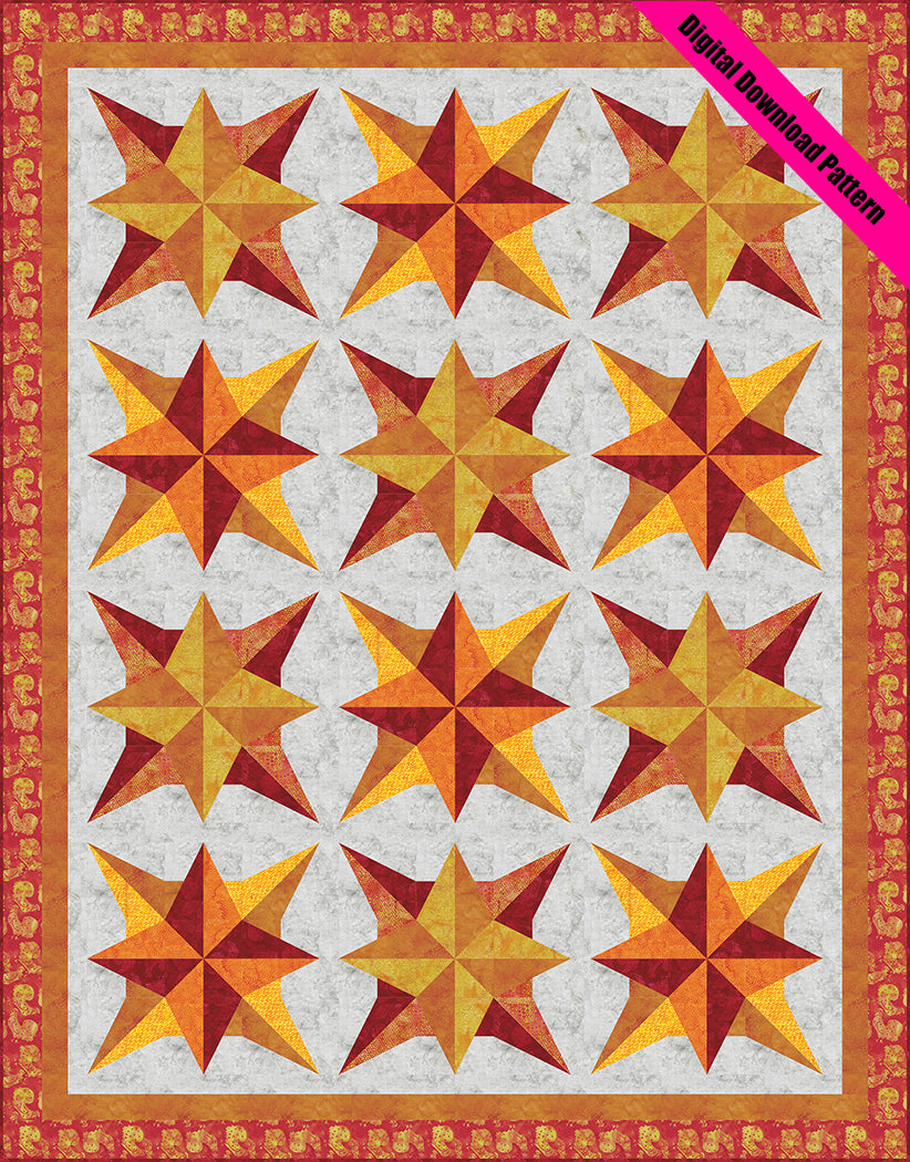 Lucky Stars is a quilt pattern by Heidi Pridemore for The Whimsical Workshop. This 70" x 89.5" quilt is great for intermediate quilters, showcasing pieced, abstract, cool or warm colored versions . It features fabrics from the "Chickadee" fabric line from Island Batiks.