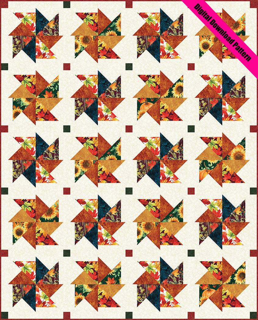 Swirling Leaves is a pieced quilt pattern by Heidi Pridemore for The Whimsical Workshop. This 55-1/2" x 69" quilt is perfect for advanced beginner quilters, featuring flowing leaf-inspired blocks that create beautiful movement across the quilt top. The quilt image showcases fabrics from the "Autumn is in the Air" fabric line from Hoffman California Fabrics.