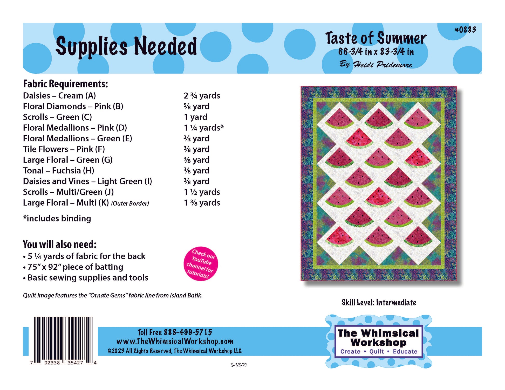 Celebrate the sweetness of the season with Taste of Summer, a quilt pattern by Heidi Pridemore for The Whimsical Workshop. This vibrant 67" x 84" design features playful watermelon blocks and showcases Ornate Gems, Heidi’s signature batik collection from Island Batik. Ideal for advanced beginners, the pattern combines traditional piecing with basic curved piecing and includes full-size templates for easy, accurate assembly. A perfect summertime project bursting with color, creativity, and fresh batik style.