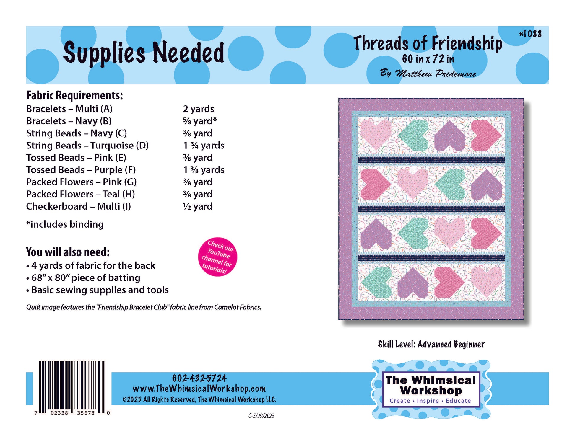 Share the joy of connection with Threads of Friendship, a heartfelt quilt pattern by Matthew Pridemore for The Whimsical Workshop. Measuring 60" x 72", this advanced beginner-friendly design features pastel pieced hearts that symbolize love, kindness, and lasting bonds. Created with the Friendship Bracelet Club collection from Camelot Fabrics, the quilt brings soft color and playful charm to any space. Perfect as a gift for a loved one or a cheerful addition to your home décor, this project is both meaningful and fun to make.