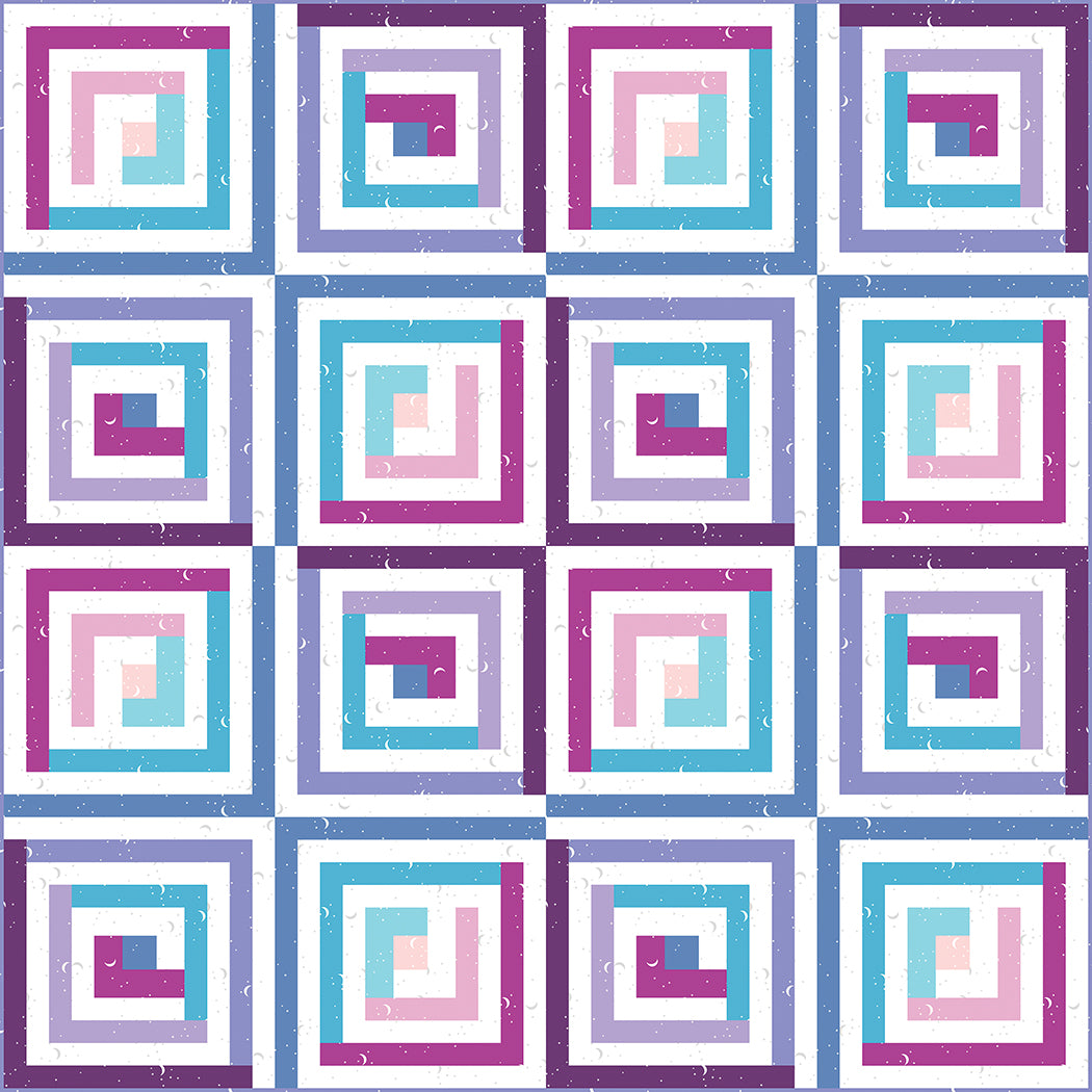 Quilt image features the "Moon and Stars" fabric line from Andover Fabrics.